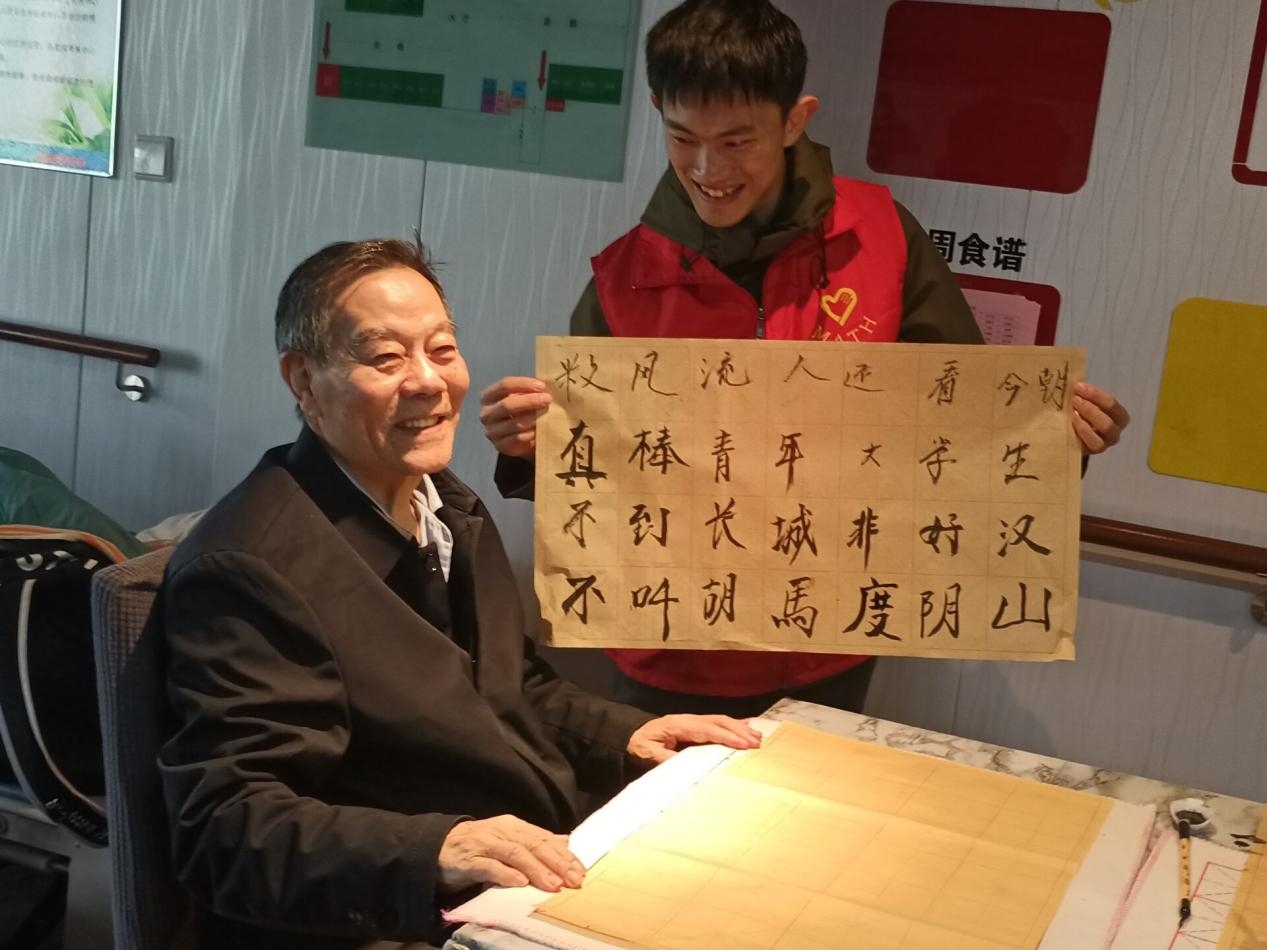 笔墨留痕。志愿者与老人共同进行书法创作,国风浓厚的毛笔字让大家跨越了年龄的鸿沟,宣纸与墨汁的碰撞也拉近了同学们与老人的距离,同学们惊叹于老人们的笔法力透纸背、入木三分,老人们也热情地将经验和技法传授给同学们,大家在切磋交流中感受着毛笔的起落顿挫,享受运墨收笔、体会一撇一捺间蕴含的人生哲理。