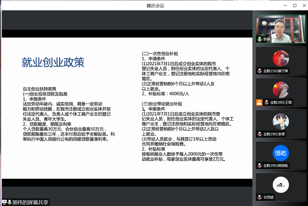 为更好地帮助在校学生了解疫情下的就业形势,做好职业生涯规划,5月20日晚,应我院邀请,上海睿函教育科技有限公司总经理郭伟做客南财就业讲堂,云端开展“职业生涯规划及就业创业政策解析”就业专题讲座,我院2019、2020级全体学生,部分2018级学生参加了讲座。