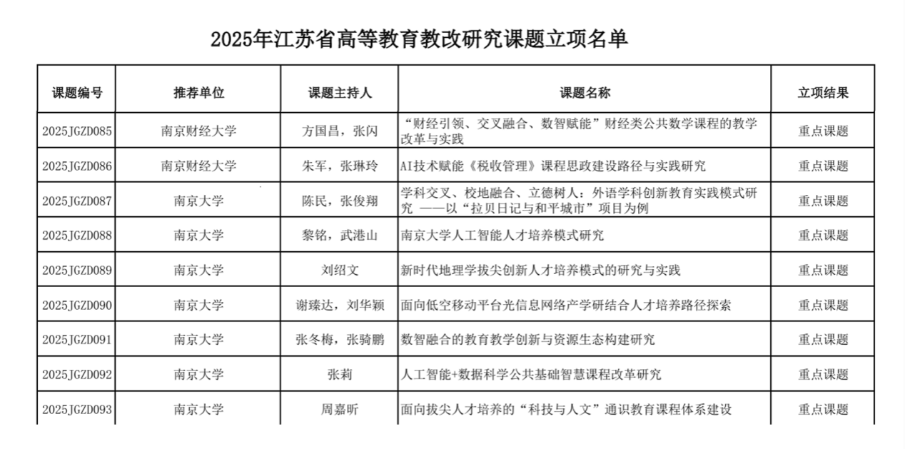 近日,江苏省高等教育学会发布了《关于公布2025年江苏省高等教育教改研究课题立项评选结果的通知》(苏高教会〔2025〕30号),我院方国昌、张闪老师主持的《“财经引领、交叉融合、数智赋能”财经类公共数学课程的教学改革与实践》课题获批重点课题立项,标志着我院在教育教学改革领域的探索再获佳绩。