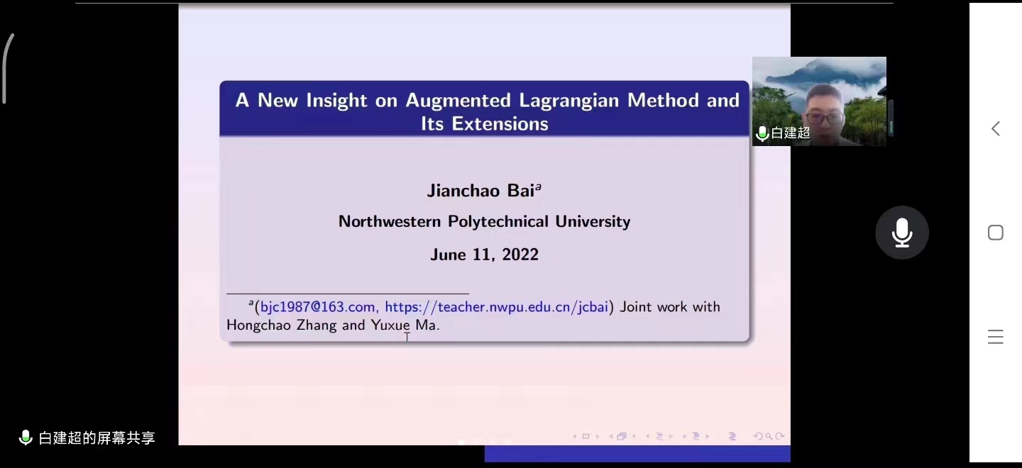 6月11日上午,应伟德victor1946邀请,西北工业大学白建超副教授通过腾讯会议作了题为“A New Insight on Augmented Lagrangian Method and Its Extensions”的线上学术讲座。学院硕士研究生、部分教师参加了此次讲座。白建超副教授首先介绍了ALM算法的应用背...